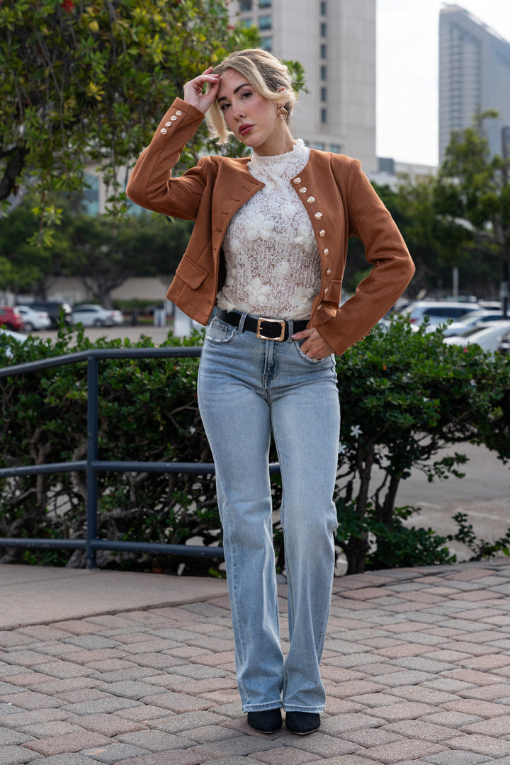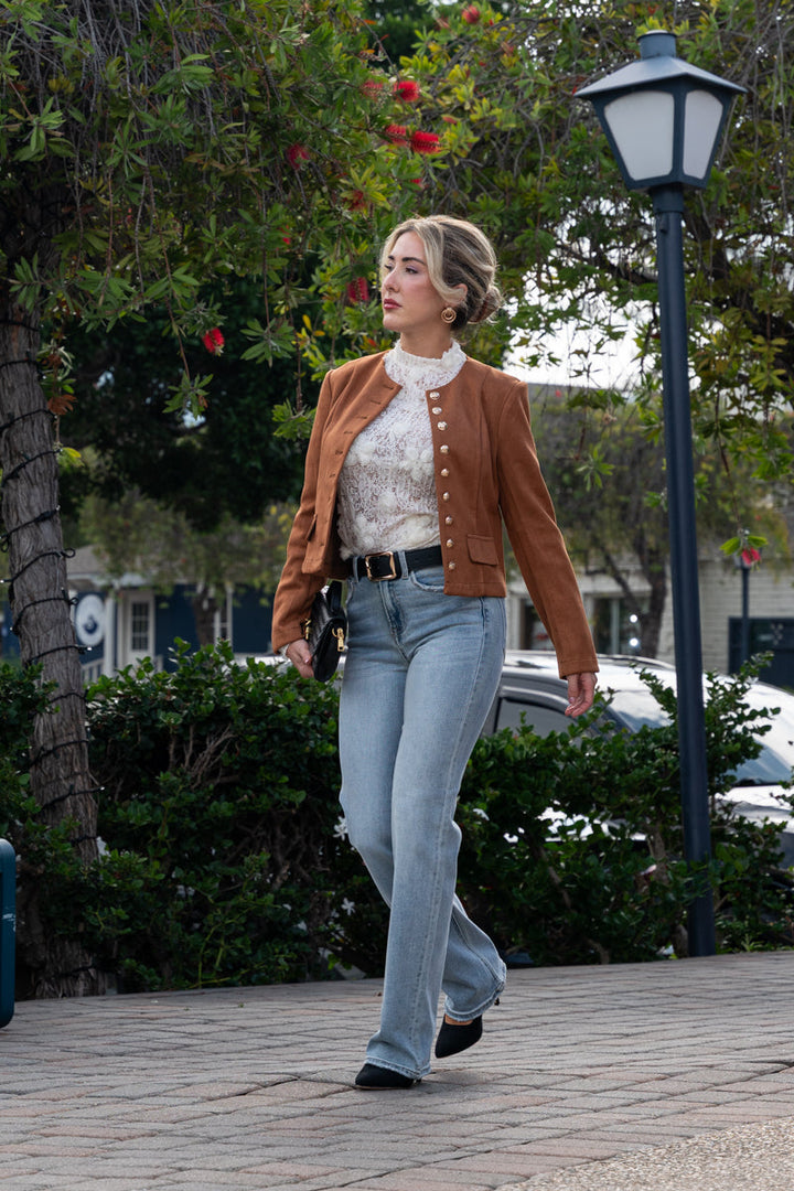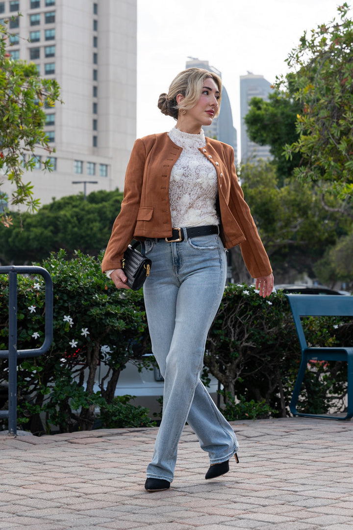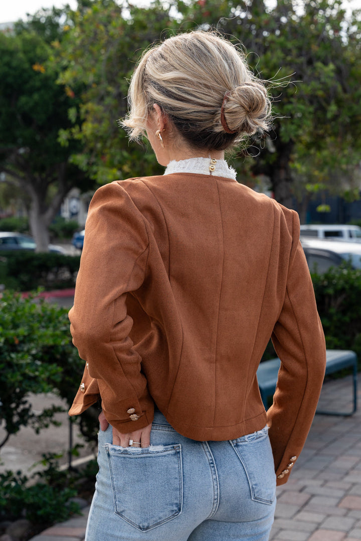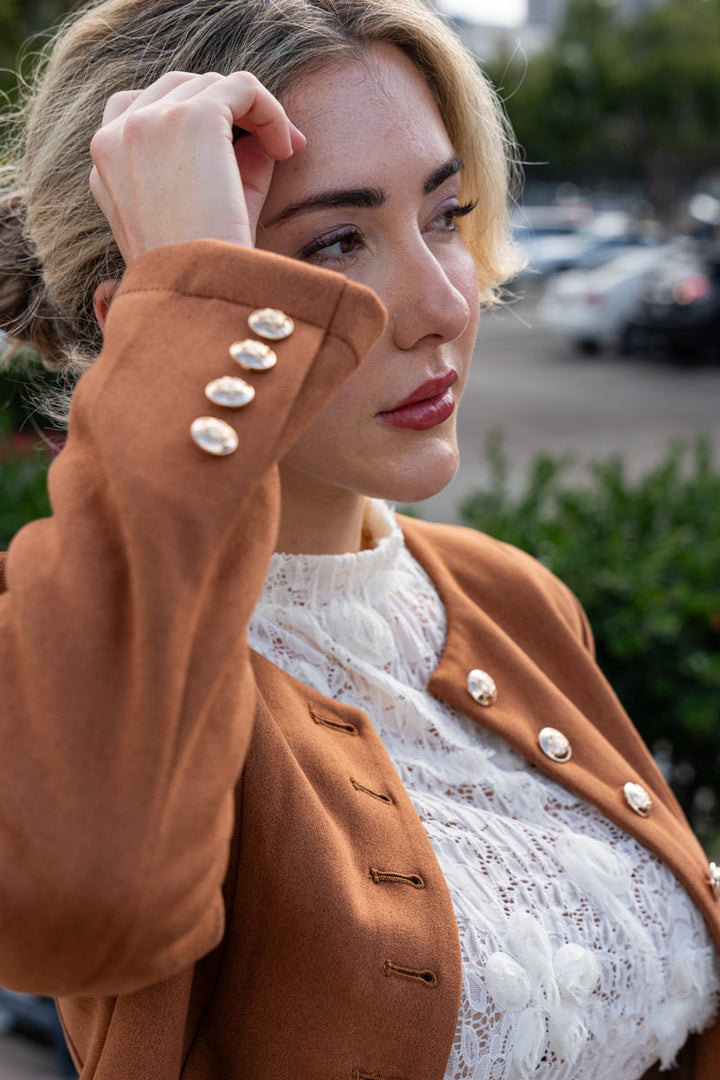 Stiline cesur bir dokunuş kat! Kahverengi renkteki Vegan Süet Ceket, modern yüksek yaka detayı ve şık düğmeli ön kapamasıyla kombinlerine sofistike bir hava katar. Bel hizasında tasarlanan modeli, pratik cepleri ve düğmeli manşetleriyle hem işlevsellik hem de zarif bir görünüm sunar. Günlük şıklığını tamamlamak için yeni favorin olacak.