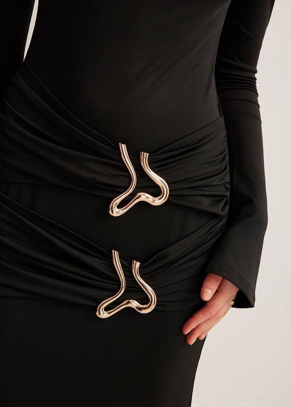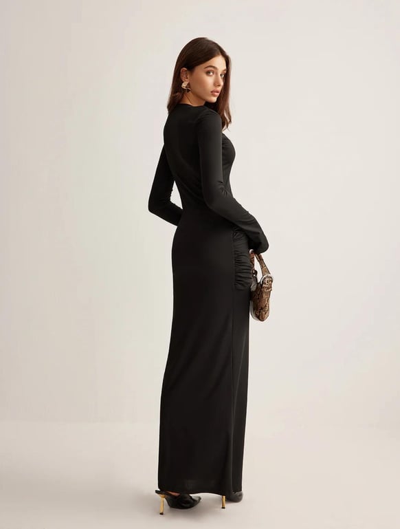 Büzgü detaylı siyah maxi elbise – feminen hatları öne çıkaran sofistike tasarım.