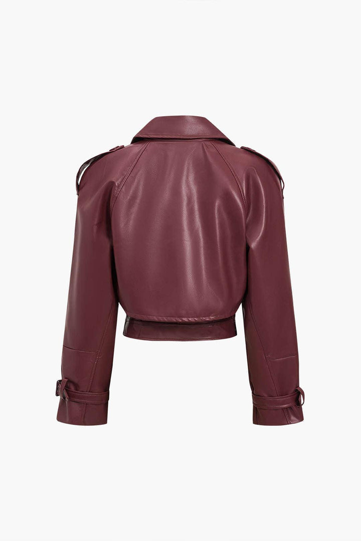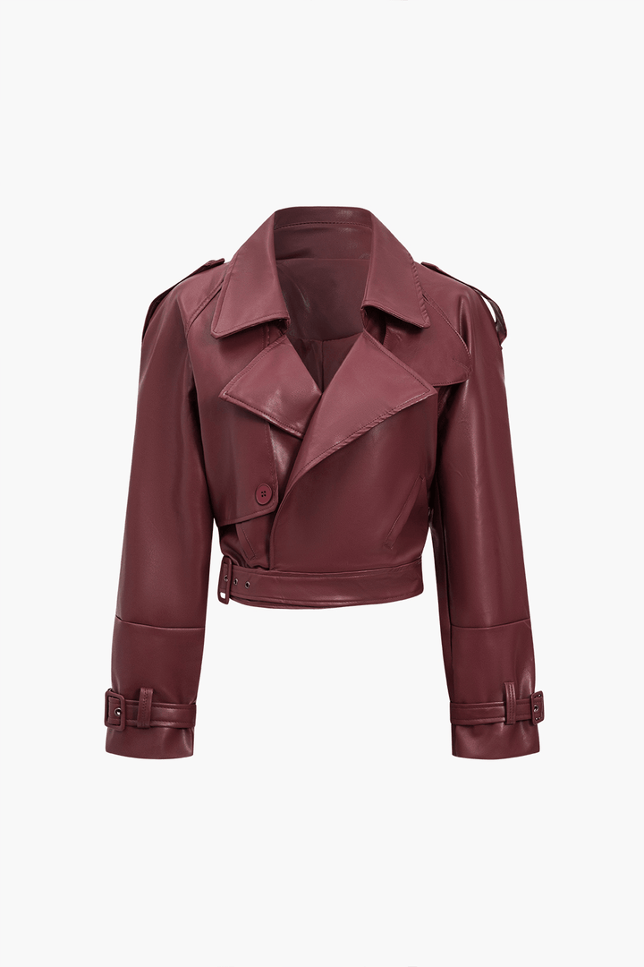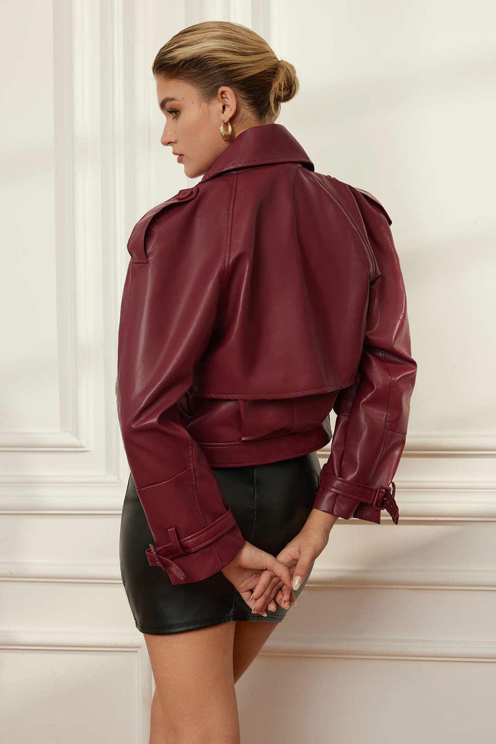 Kısa deri görünümlü bordo ceket – feminen ve modern hatları vurgulayan tasarım.