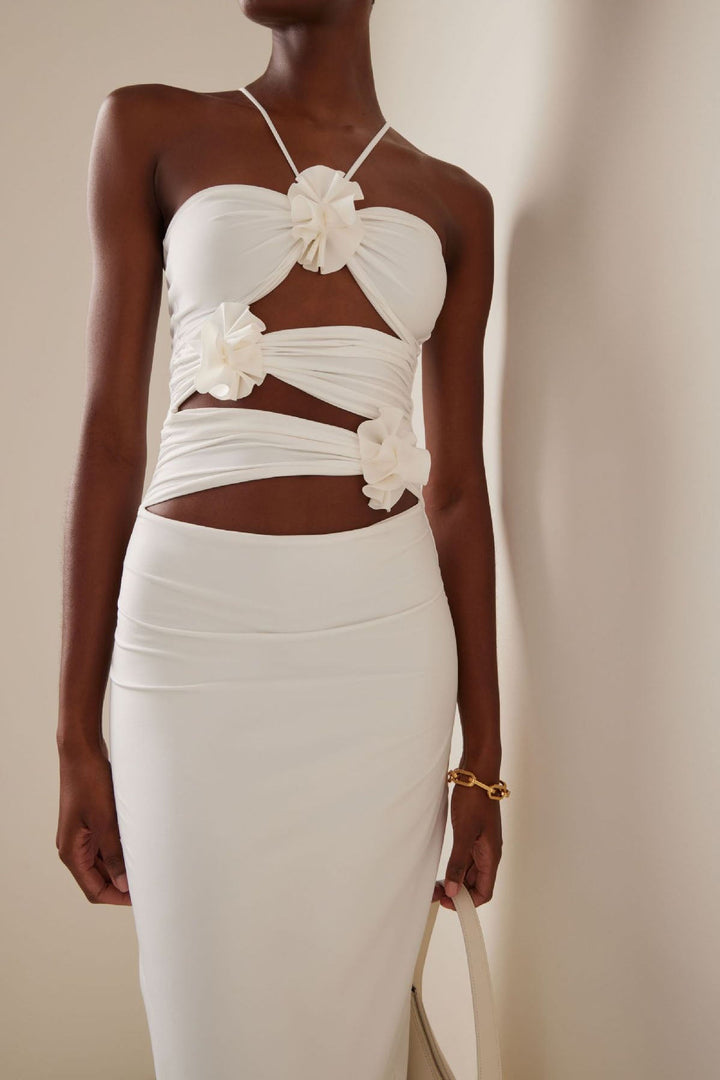 Çiçek Düğüm Detaylı Beyaz Maxi Elbise
