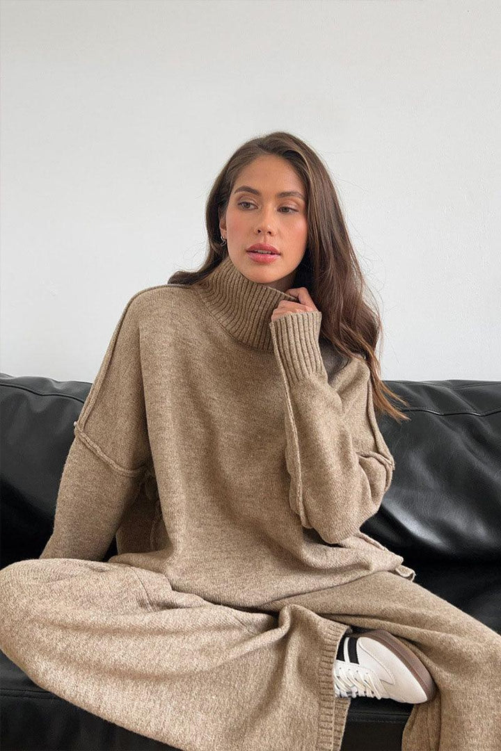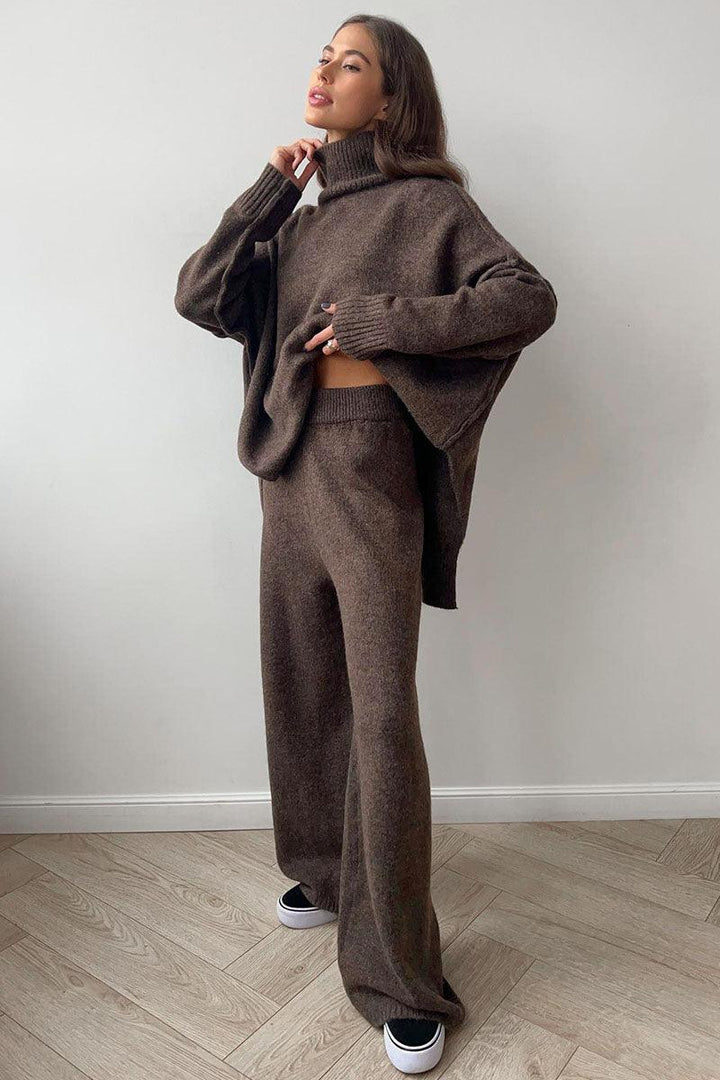 Balıkçı Yaka Yırtmaçlı Kazak Gevşek Örgü Pantolon Seti, rahat, sofistike ve rahat tarzın mükemmel birleşimidir. Şık bölünmüş tasarıma sahip yüksek yakalı bir kazak ve bol kesim, geniş paçalı örgü pantolon içeren bu set, uzanmak veya gündelik geziler için mükemmel olan lüks ve konforlu bir kıyafet sunuyor. Yumuşak, nefes alabilen kumaş sizi sıcak ve rahat tutarken modern tasarım, rahat görünümünüze şıklık katıyor.